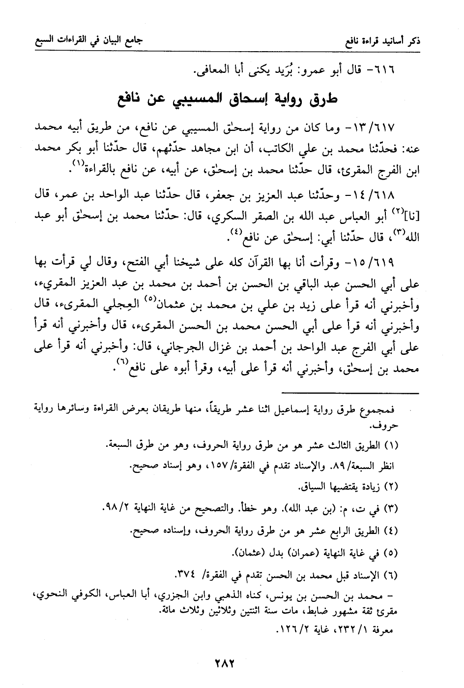 617/ 13 - وما كان من رواية إسحاق المسيبي عن نافع، من طريق أبيه محمد عنه: فحدّثنا محمد بن علي الكاتب، أن ابن مجاهد حدّثهم، قال حدّثنا أبو بكر محمد ابن الفرج المقرئ، قال حدّثنا محمد بن إسحاق، عن أبيه، عن نافع بالقراءة «1».