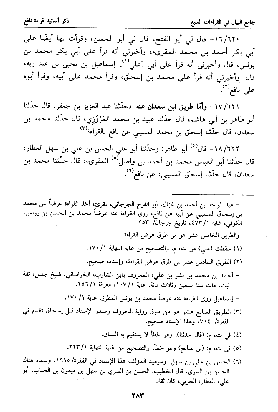 620/ 16 - قال لي أبو الفتح، قال لي أبو الحسن، وقرأت بها أيضا على أبي بكر أحمد بن محمد المقرئ، وأخبرني أنه قرأ على أبي بكر محمد بن يونس، قال وأخبرني أنه قرأ على أبي [علي «1»] إسماعيل بن يحيى بن عبد ربه، قال: وأخبرني أنه قرأ على محمد بن إسحاق، وقرأ محمد على أبيه، وقرأ أبوه على نافع «2».