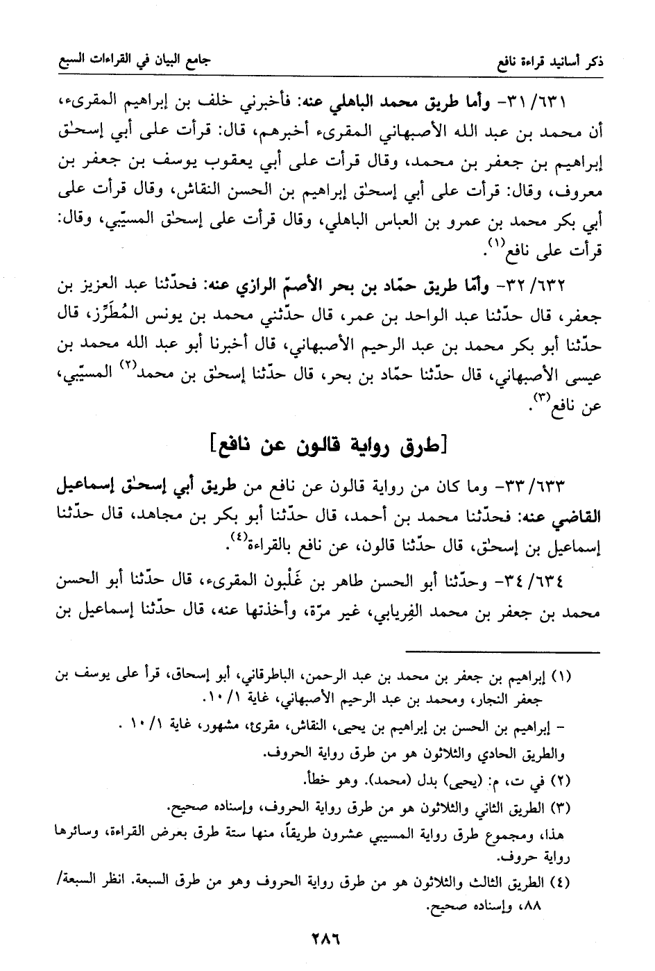 633/ 33 - وما كان من رواية قالون عن نافع من طريق أبي إسحق إسماعيل القاضي عنه: فحدّثنا محمد بن أحمد، قال حدّثنا أبو بكر بن مجاهد، قال حدّثنا إسماعيل بن إسحاق، قال حدّثنا قالون، عن نافع بالقراءة «4».