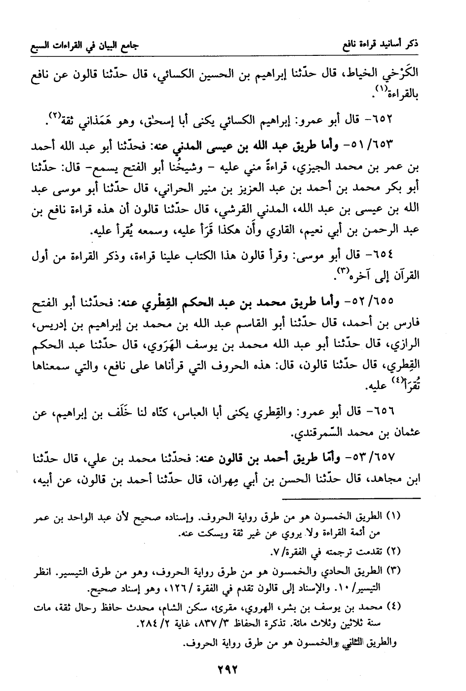 (3) الطريق الحادي والخمسون هو من طرق رواية الحروف، وهو من طرق التيسير. انظر التيسير/ 10. والإسناد إلى قالون تقدم في الفقرة/ 126، وهو إسناد صحيح.