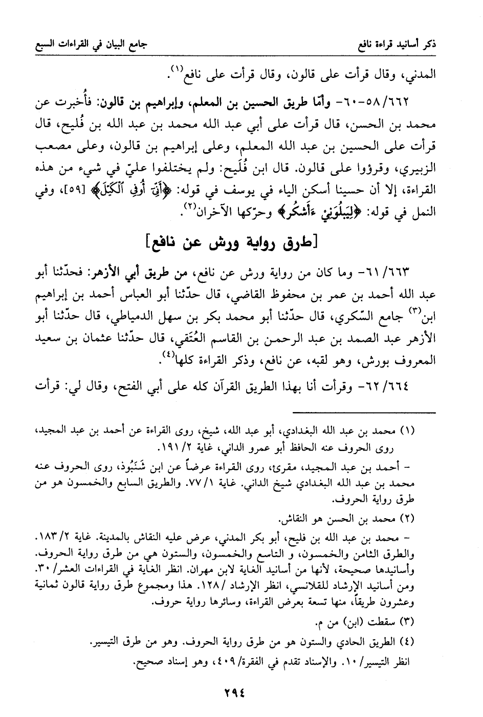 663/ 61 - وما كان من رواية ورش عن نافع، من طريق أبي الأزهر: فحدّثنا أبو عبد الله أحمد بن عمر بن محفوظ القاضي، قال حدّثنا أبو العباس أحمد بن إبراهيم ابن «3» جامع السّكري، قال حدّثنا أبو محمد بكر بن سهل الدمياطي، قال حدّثنا أبو الأزهر عبد الصمد بن عبد الرحمن بن القاسم العتقي، قال حدّثنا عثمان بن سعيد المعروف بورش، وهو لقبه، عن نافع، وذكر القراءة كلها «4».