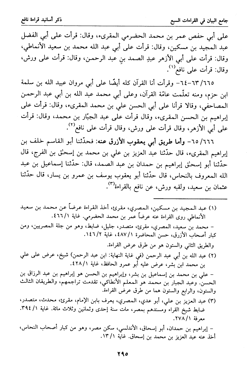 665/ 63 - 64 - وقرأت أنا القرآن كله أيضا على أبي مروان عبيد الله بن سلمة ابن حزم، ومنه تعلّمت عامّة القرآن، وعلى أبي محمد عبد الله بن أبي عبد الرحمن المصاحفي، وقالا قرأنا على أبي الحسن علي بن محمد المقرئ، وقال: قرأت على إبراهيم بن الحسن المقرئ، وقال قرأت على عبد الجبّار بن محمد، وقال: قرأت على أبي الأزهر، وقال قرأت على ورش، وقال قرأت على نافع «2».