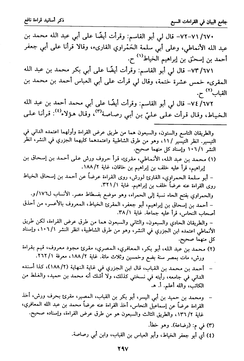 670/ 71 - 72 - قال لي أبو القاسم: وقرأت أيضا على أبي عبد الله محمد بن عبد الله الأنماطي، وعلى أبي سلمة الحمراوي القارئ، وقالا قرأنا على أبي جعفر أحمد بن إسحاق بن إبراهيم الخياط «1» ح.