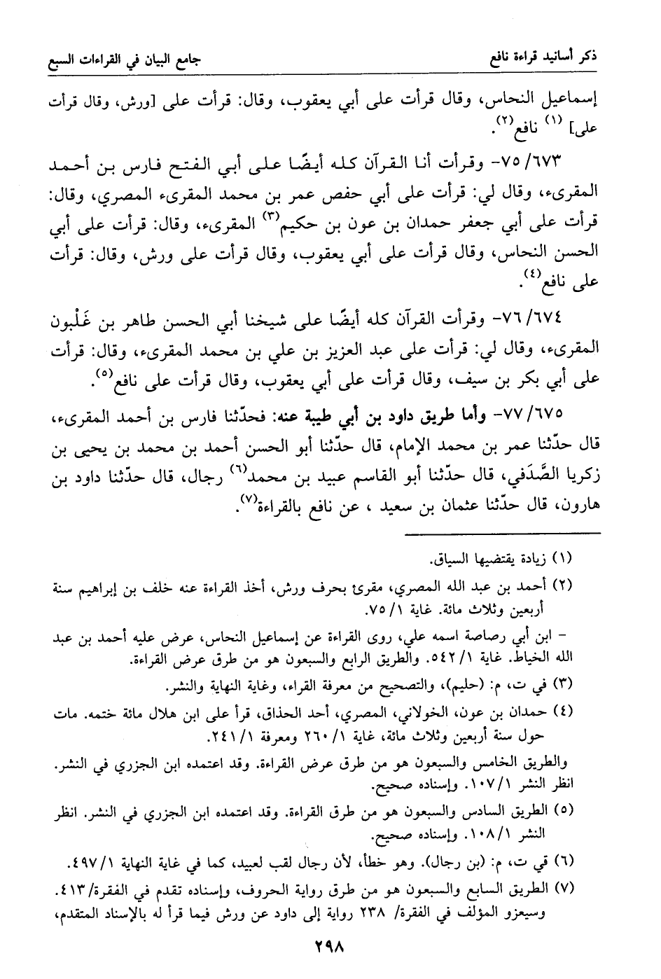 675/ 77 - وأما طريق داود بن أبي طيبة عنه: فحدّثنا فارس بن أحمد المقرئ، قال حدّثنا عمر بن محمد الإمام، قال حدّثنا أبو الحسن أحمد بن محمد بن يحيى بن زكريا الصّدفي، قال حدّثنا أبو القاسم عبيد بن محمد «6» رجال، قال حدّثنا داود بن هارون، قال حدّثنا عثمان بن سعيد، عن نافع بالقراءة «7».
