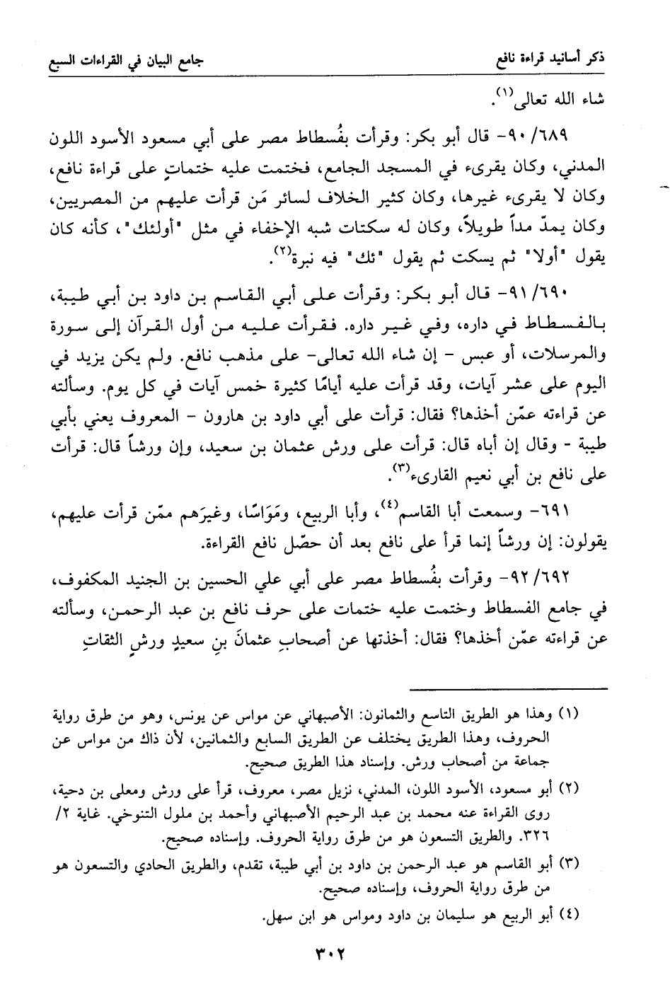 (2) أبو مسعود، الأسود اللون، المدني، نزيل مصر، معروف، قرأ على ورش ومعلى بن دحية، روى القراءة عنه محمد بن عبد الرحيم الأصبهاني وأحمد بن ملول التنوخي. غاية 2/ 326. والطريق التسعون هو من طرق رواية الحروف. وإسناده صحيح.