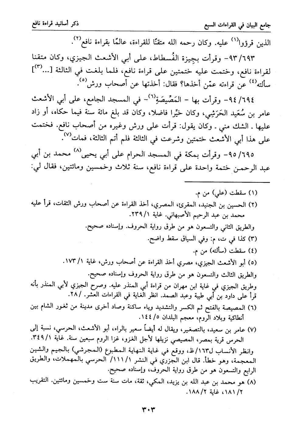 695/ 95 - وقرأت بمكة في المسجد الحرام على أبي يحيى «8» محمد بن أبي عبد الرحمن ختمة واحدة على قراءة نافع، سنة ثلاث وخمسين ومائتين، فقال لي: