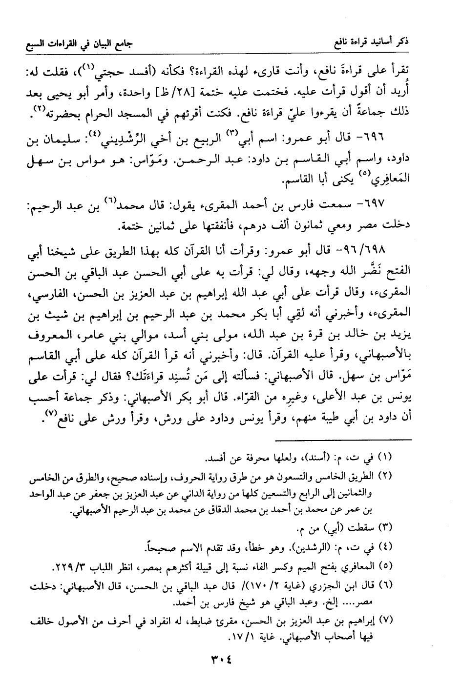 698/ 96 - قال أبو عمرو: وقرأت أنا القرآن كله بهذا الطريق على شيخنا أبي الفتح نضّر الله وجهه، وقال لي: قرأت به على أبي الحسن عبد الباقي بن الحسن المقرئ، وقال قرأت على أبي عبد الله إبراهيم بن عبد العزيز بن الحسن، الفارسي، المقرئ، وأخبرني أنه لقي أبا بكر محمد بن عبد الرحيم بن إبراهيم بن شيث بن يزيد بن خالد بن قرة بن عبد الله، مولى بني أسد، موالي بني عامر، المعروف بالأصبهاني، وقرأ عليه القرآن. قال: وأخبرني أنه قرأ القرآن كله على أبي القاسم موّاس بن سهل. قال الأصبهاني: فسألته إلى من تسند قراءتك؟ فقال لي: قرأت على يونس بن عبد الأعلى، وغيره من القرّاء. قال أبو بكر الأصبهاني: وذكر جماعة أحسب أن داود بن أبي طيبة منهم، وقرأ يونس وداود على ورش، وقرأ ورش على نافع «7».