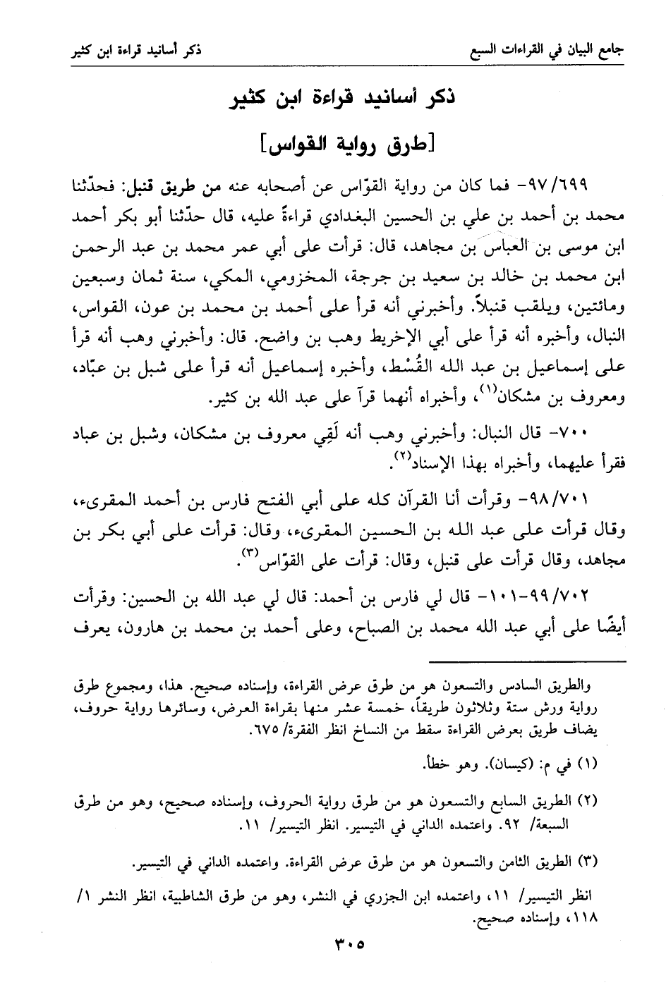 699/ 97 - فما كان من رواية القوّاس عن أصحابه عنه من طريق قنبل: فحدّثنا محمد بن أحمد بن علي بن الحسين البغدادي قراءة عليه، قال حدّثنا أبو بكر أحمد ابن موسى بن العباس بن مجاهد، قال: قرأت على أبي عمر محمد بن عبد الرحمن ابن محمد بن خالد بن سعيد بن جرجة، المخزومي، المكي، سنة ثمان وسبعين ومائتين، ويلقب قنبلا. وأخبرني أنه قرأ على أحمد بن محمد بن عون، القواس، النبال، وأخبره أنه قرأ على أبي الإخريط وهب بن واضح. قال: وأخبرني وهب أنه قرأ على إسماعيل بن عبد الله القسط، وأخبره إسماعيل أنه قرأ على شبل بن عبّاد، ومعروف بن مشكان «1»، وأخبراه أنهما قرآ على عبد الله بن كثير.