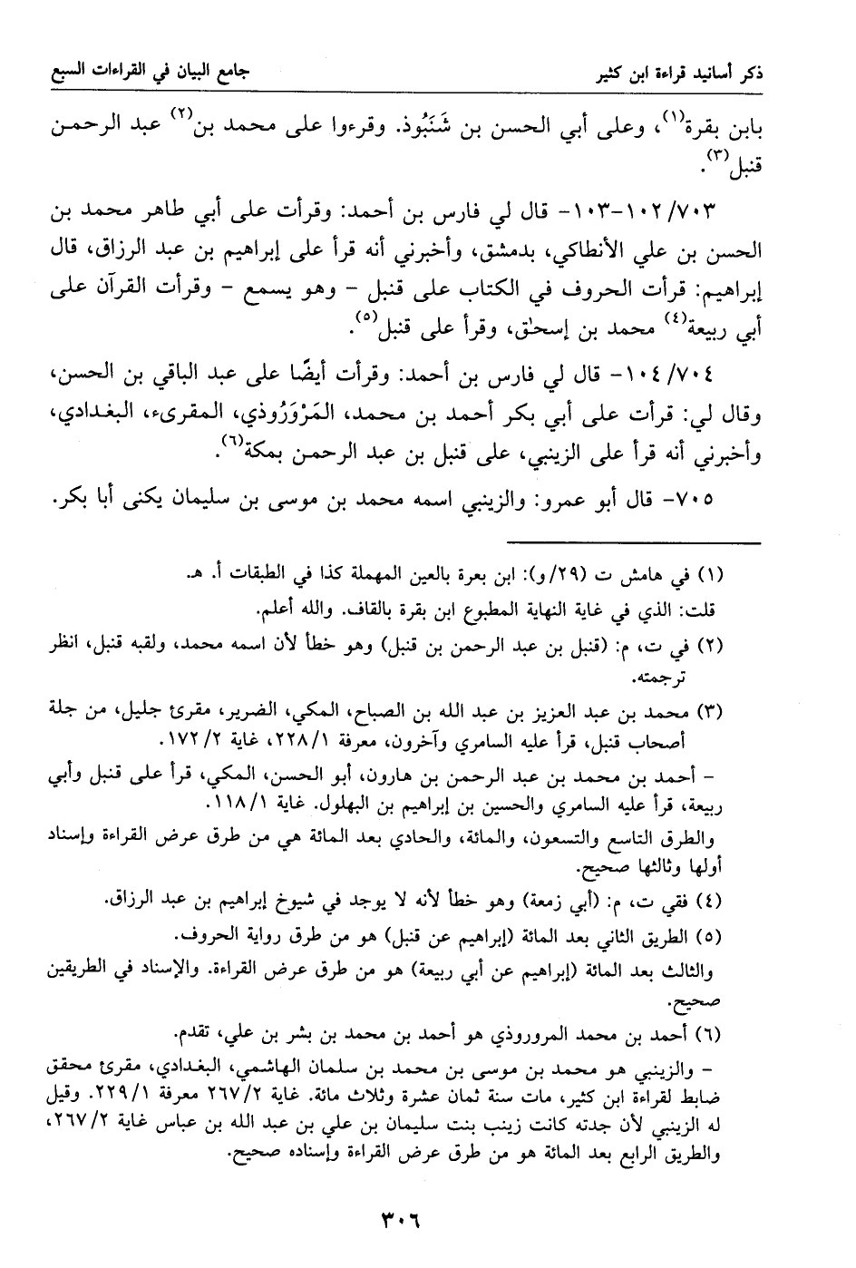 704/ 104 - قال لي فارس بن أحمد: وقرأت أيضا على عبد الباقي بن الحسن، وقال لي: قرأت على أبي بكر أحمد بن محمد، المروروذي، المقرئ، البغدادي، وأخبرني أنه قرأ على الزينبي، على قنبل بن عبد الرحمن بمكة «6».