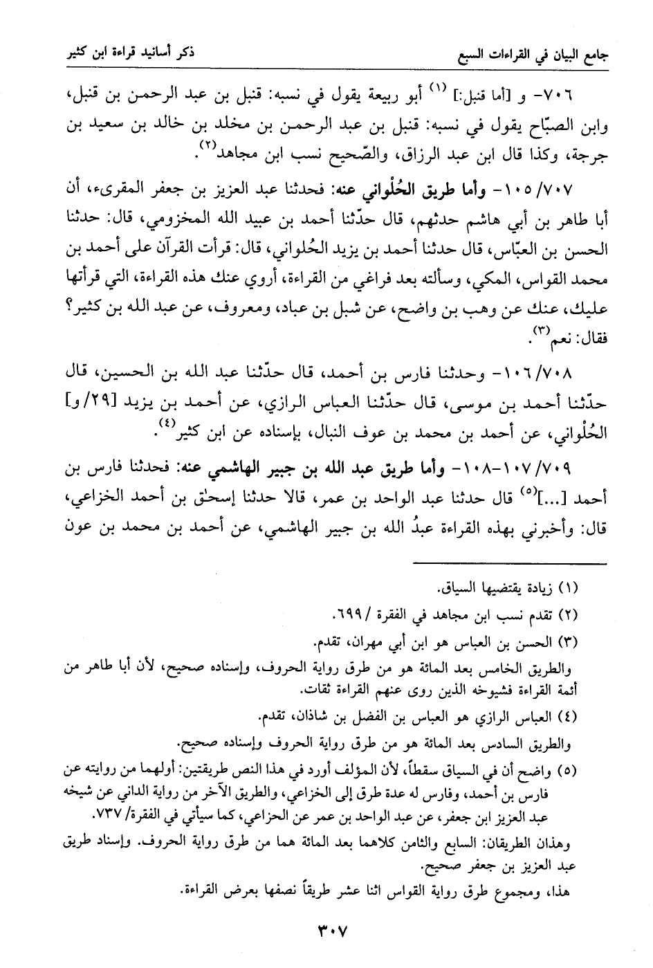 707/ 105 - وأما طريق الحلواني عنه: فحدّثنا عبد العزيز بن جعفر المقرئ، أن أبا طاهر بن أبي هاشم حدثهم، قال حدّثنا أحمد بن عبيد الله المخزومي، قال: حدثنا الحسن بن العبّاس، قال حدثنا أحمد بن يزيد الحلواني، قال: قرأت القرآن على أحمد بن محمد القواس، المكي، وسألته بعد فراغي من القراءة، أروي عنك هذه القراءة، التي قرأتها عليك، عنك عن وهب بن واضح، عن شبل بن عباد، ومعروف، عن عبد الله بن كثير؟