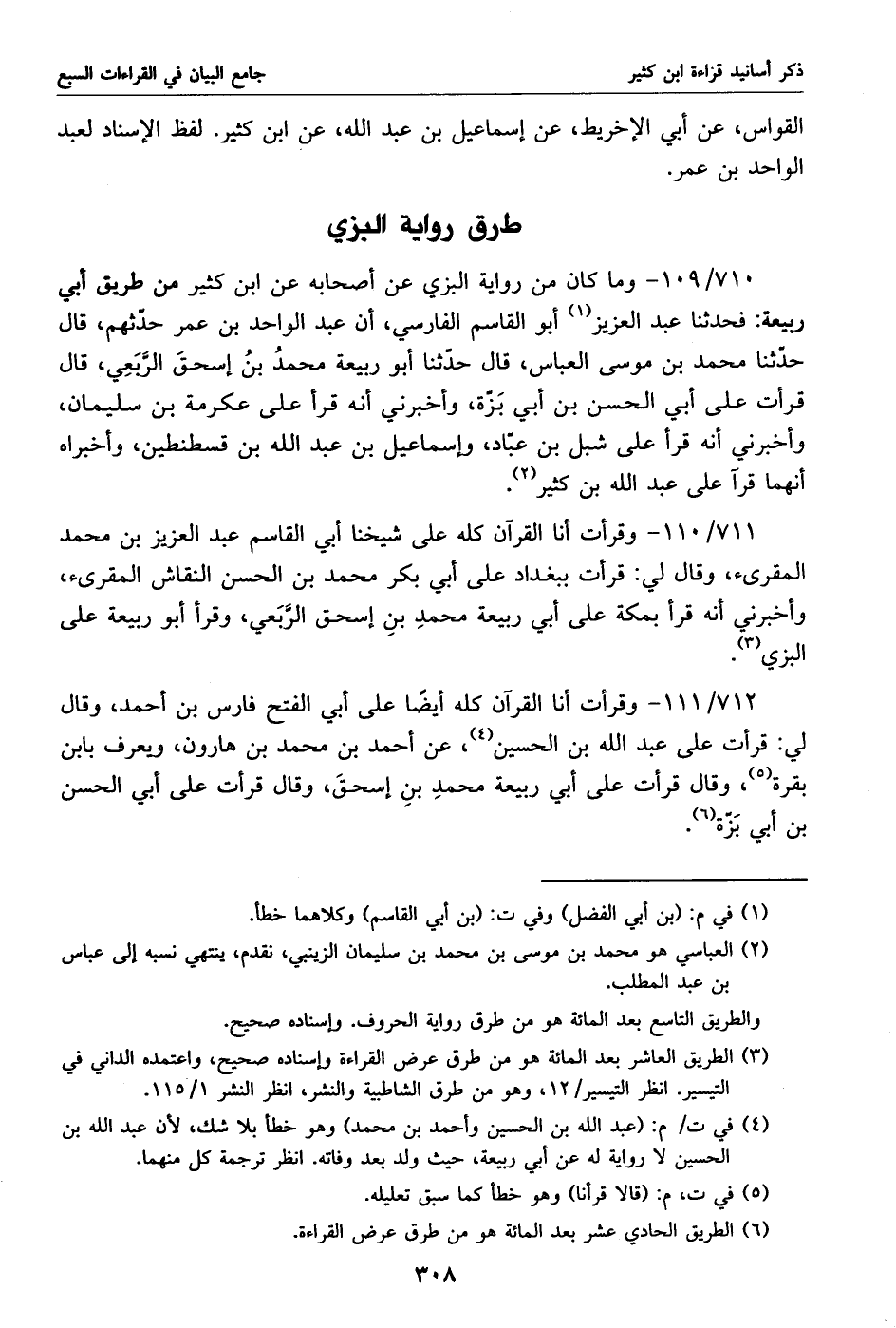 710/ 109 - وما كان من رواية البزي عن أصحابه عن ابن كثير من طريق أبي ربيعة: فحدثنا عبد العزيز «1» أبو القاسم الفارسي، أن عبد الواحد بن عمر حدّثهم، قال حدّثنا محمد بن موسى العباس، قال حدّثنا أبو ربيعة محمد بن إسحاق الرّبعي، قال قرأت على أبي الحسن بن أبي بزّة، وأخبرني أنه قرأ على عكرمة بن سليمان، وأخبرني أنه قرأ على شبل بن عبّاد، وإسماعيل بن عبد الله بن قسطنطين، وأخبراه أنهما قرآ على عبد الله بن كثير «2».