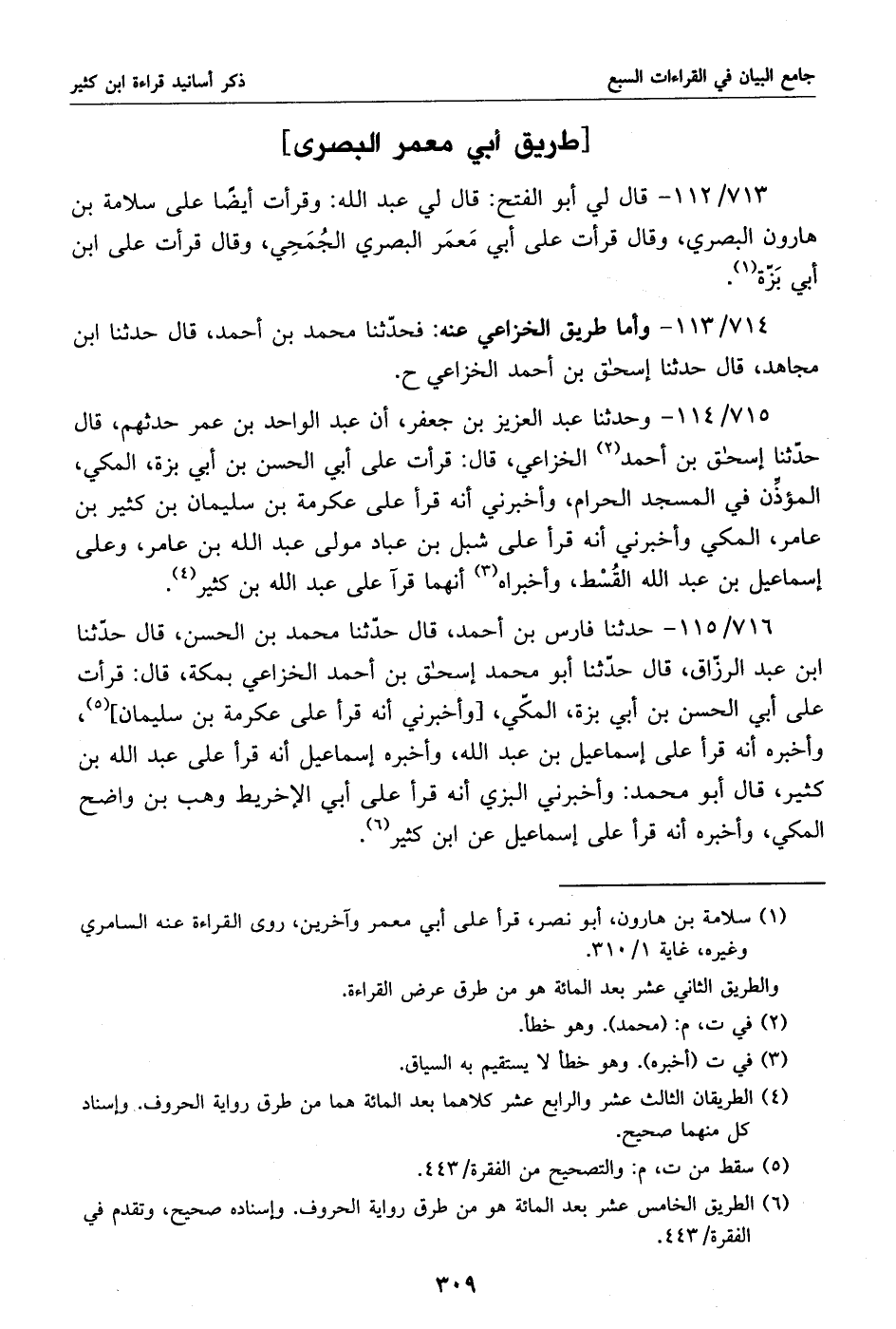 713/ 112 - قال لي أبو الفتح: قال لي عبد الله: وقرأت أيضا على سلامة بن هارون البصري، وقال قرأت على أبي معمر البصري الجمحي، وقال قرأت على ابن أبي بزّة «1».