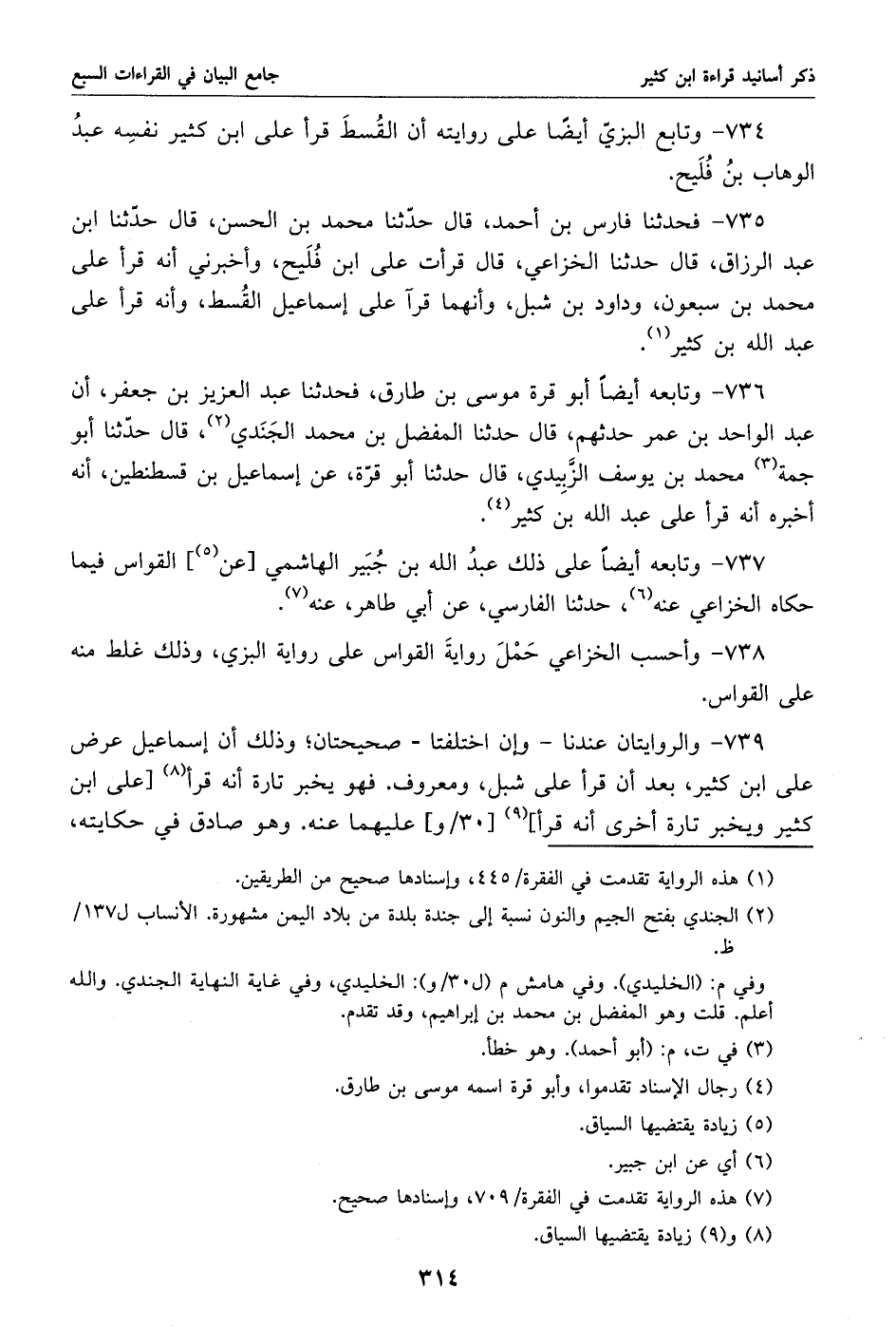 734 - وتابع البزيّ أيضا على روايته أن القسط قرأ على ابن كثير نفسه عبد الوهاب بن فليح.