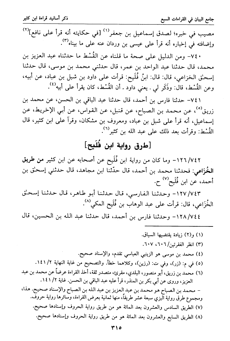 741 - حدثنا فارس بن أحمد، قال حدثنا عبد الباقي بن الحسن، عن محمد بن زريق «5»، عن محمد بن الصباح، عن قنبل، عن القواس، عن أبي الإخريط، عن إسماعيل، أنه قرأ على شبل بن عباد، ومعروف بن مشكان، وقرآ على ابن كثير، قال القسط: وقرأت بعد ذلك على عبد الله بن كثير «6».