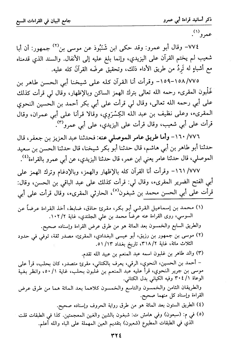 776/ 160 - وأما طريق عامر الموصلي عنه: فحدثنا عبد العزيز بن جعفر، قال حدثنا أبو طاهر بن أبي هاشم، قال حدثنا أبو بكر شيخنا، قال حدثنا الحسن بن سعيد الموصلي، قال حدثنا عامر يعني ابن عمر، قال حدثنا اليزيدي، عن أبي عمرو بالقراءة «4».