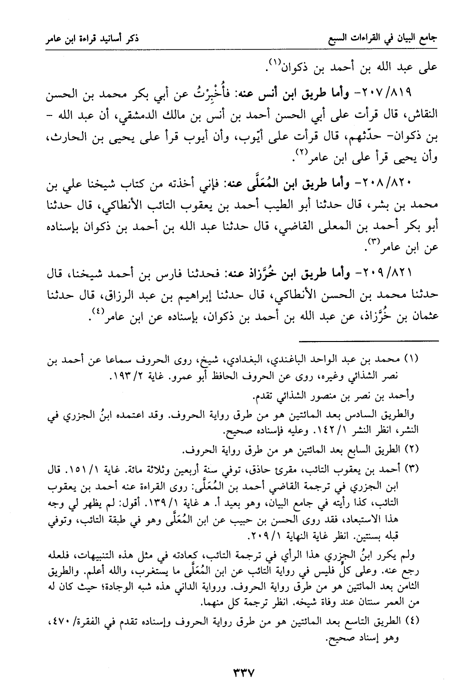 820/ 208 - وأما طريق ابن المعلّى عنه: فإني أخذته من كتاب شيخنا علي بن محمد بن بشر، قال حدثنا أبو الطيب أحمد بن يعقوب التائب الأنطاكي، قال حدثنا أبو بكر أحمد بن المعلى القاضي، قال حدثنا عبد الله بن أحمد بن ذكوان بإسناده عن ابن عامر «3».