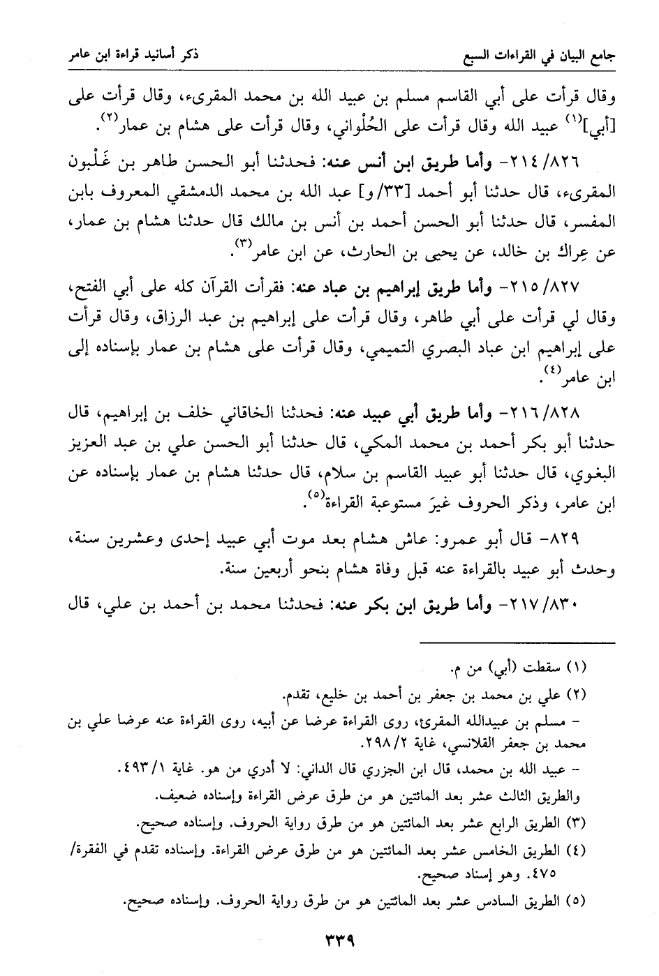 826/ 214 - وأما طريق ابن أنس عنه: فحدثنا أبو الحسن طاهر بن غلبون المقرئ، قال حدثنا أبو أحمد [33/ و] عبد الله بن محمد الدمشقي المعروف بابن المفسر، قال حدثنا أبو الحسن أحمد بن أنس بن مالك قال حدثنا هشام بن عمار، عن عراك بن خالد، عن يحيى بن الحارث، عن ابن عامر «3».