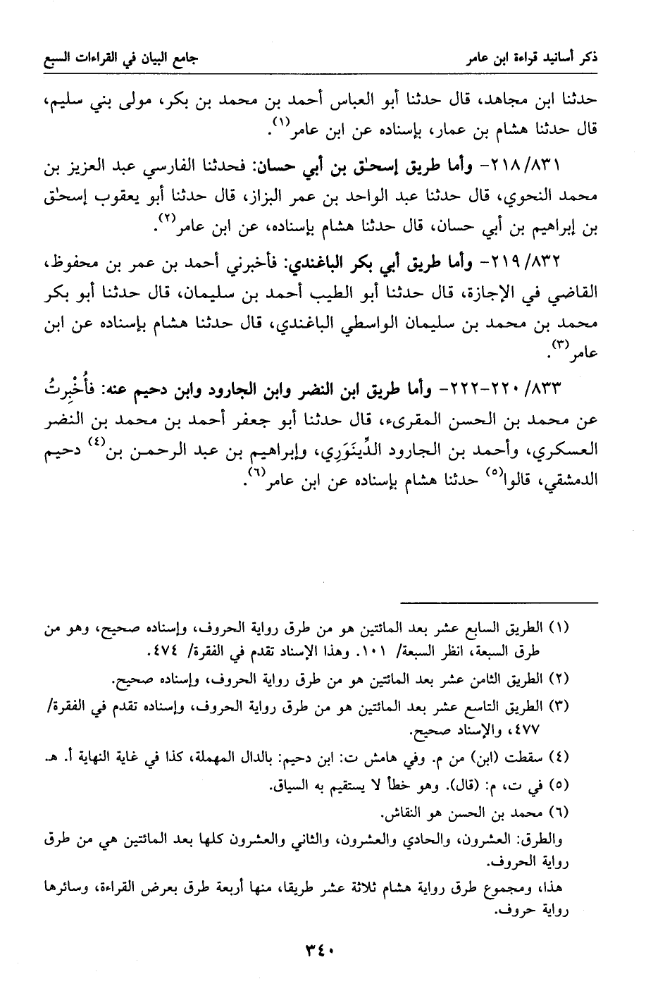 833/ 220 - 222 - وأما طريق ابن النضر وابن الجارود وابن دحيم عنه: فأخبرت عن محمد بن الحسن المقرئ، قال حدثنا أبو جعفر أحمد بن محمد بن النضر العسكري، وأحمد بن الجارود الدّينوري، وإبراهيم بن عبد الرحمن بن «4» دحيم الدمشقي، قالوا «5» حدثنا هشام بإسناده عن ابن عامر «6».