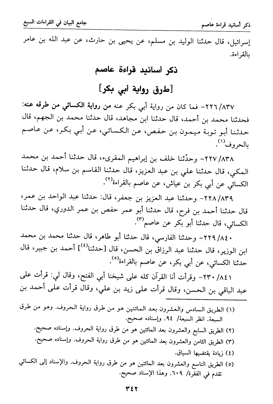839/ 228 - وحدثنا عبد العزيز بن جعفر، قال: حدثنا عبد الواحد بن عمر، قال حدثنا أحمد بن فرح، قال حدثنا أبو عمر حفص بن عمر الدوري، قال حدثنا الكسائي، قال حدثنا أبو بكر عن عاصم «3».