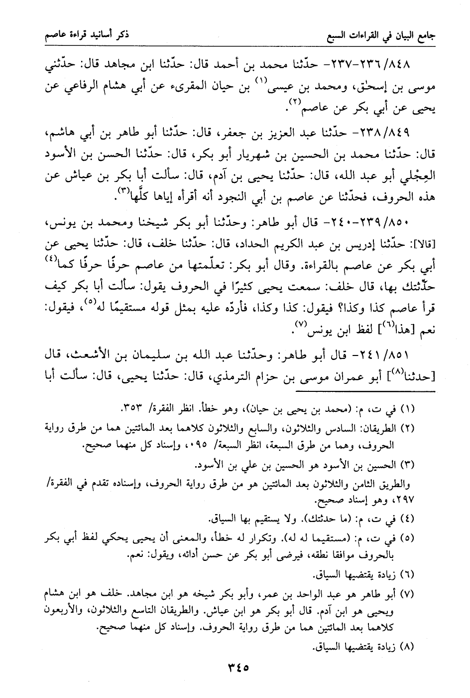 (7) أبو طاهر هو عبد الواحد بن عمر، وأبو بكر شيخه هو ابن مجاهد. خلف هو ابن هشام ويحيى هو ابن آدم. قال أبو بكر هو ابن عياش. والطريقان التاسع والثلاثون، والأربعون كلاهما بعد المائتين هما من طرق رواية الحروف. وإسناد كل منهما صحيح.