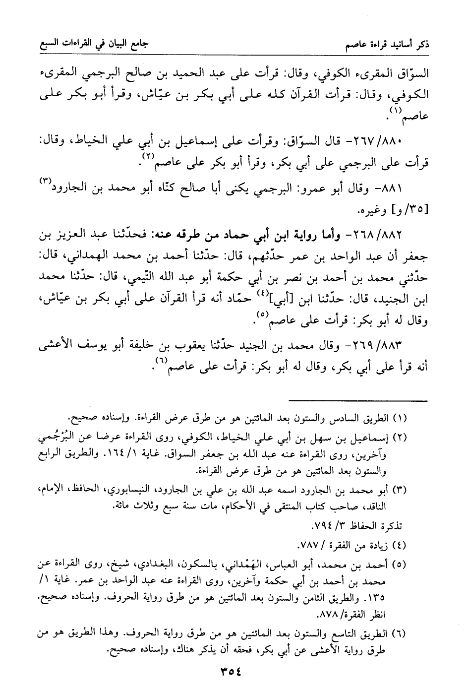 (5) أحمد بن محمد، أبو العباس، الهمداني، بالسكون، البغدادي، شيخ، روى القراءة عن محمد بن أحمد بن أبي حكمة وآخرين، روى القراءة عنه عبد الواحد بن عمر. غاية 1/ 135. والطريق الثامن والستون بعد المائتين هو من طرق رواية الحروف. وإسناده صحيح.