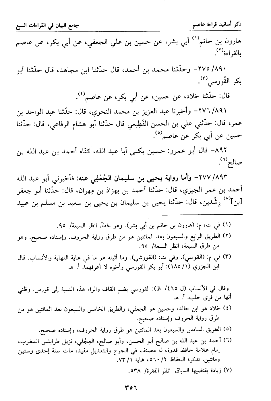 891/ 276 - وأخبرنا عبد العزيز بن محمد النحوي، قال: حدّثنا عبد الواحد بن عمر، قال: حدّثني علي بن الحسن القطيعي قال حدّثنا أبو هشام الرفاعي، قال: حدّثنا حسين عن أبي بكر عن عاصم «5».