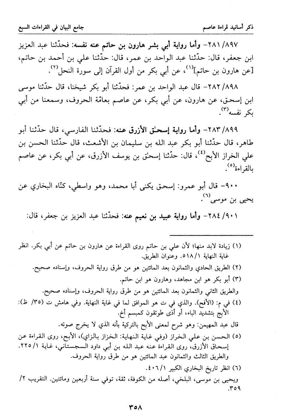 897/ 281 - وأما رواية أبي بشر هارون بن حاتم عنه نفسه: فحدّثنا عبد العزيز ابن جعفر، قال: حدّثنا عبد الواحد بن عمر، قال: حدّثنا علي بن أحمد بن حاتم، [عن هارون بن حاتم] «1»، عن أبي بكر من أول القرآن إلى سورة النحل «2».