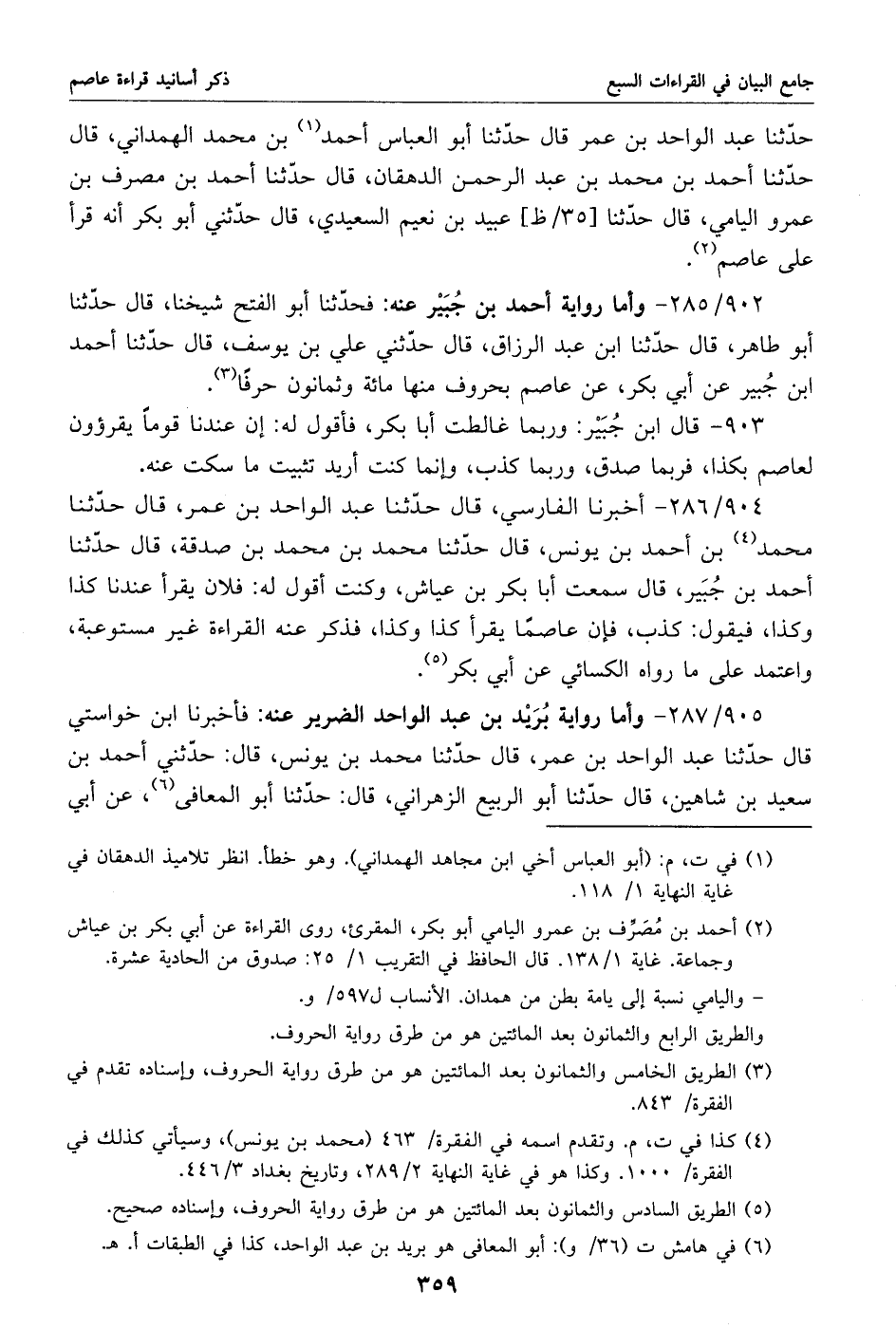 902/ 285 - وأما رواية أحمد بن جبير عنه: فحدّثنا أبو الفتح شيخنا، قال حدّثنا أبو طاهر، قال حدّثنا ابن عبد الرزاق، قال حدّثني علي بن يوسف، قال حدّثنا أحمد ابن جبير عن أبي بكر، عن عاصم بحروف منها مائة وثمانون حرفا «3».