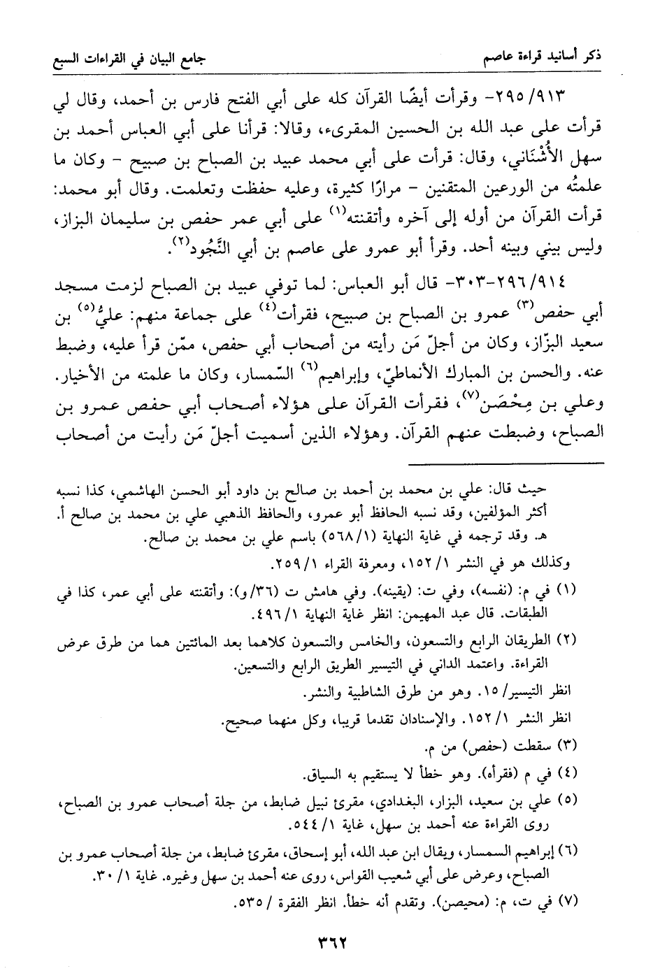 913/ 295 - وقرأت أيضا القرآن كله على أبي الفتح فارس بن أحمد، وقال لي قرأت على عبد الله بن الحسين المقرئ، وقالا: قرأنا على أبي العباس أحمد بن سهل الأشناني، وقال: قرأت على أبي محمد عبيد بن الصباح بن صبيح- وكان ما علمته من الورعين المتقنين- مرارا كثيرة، وعليه حفظت وتعلمت. وقال أبو محمد: