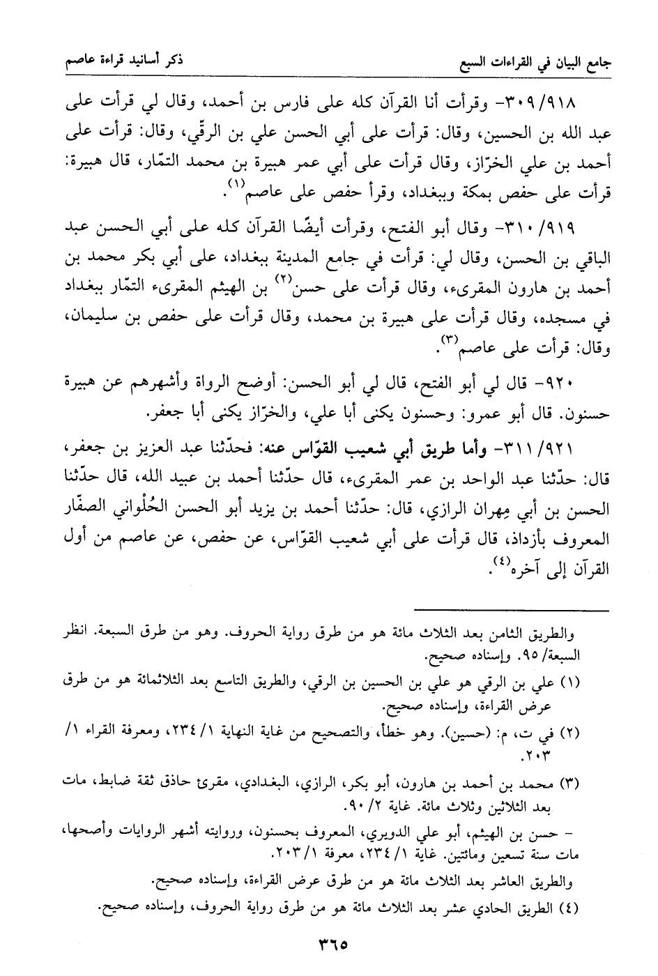 919/ 310 - وقال أبو الفتح، وقرأت أيضا القرآن كله على أبي الحسن عبد الباقي بن الحسن، وقال لي: قرأت في جامع المدينة ببغداد، على أبي بكر محمد بن أحمد بن هارون المقرئ، وقال قرأت على حسن «2» بن الهيثم المقرئ التمّار ببغداد في مسجده، وقال قرأت على هبيرة بن محمد، وقال قرأت على حفص بن سليمان، وقال: قرأت على عاصم «3».
