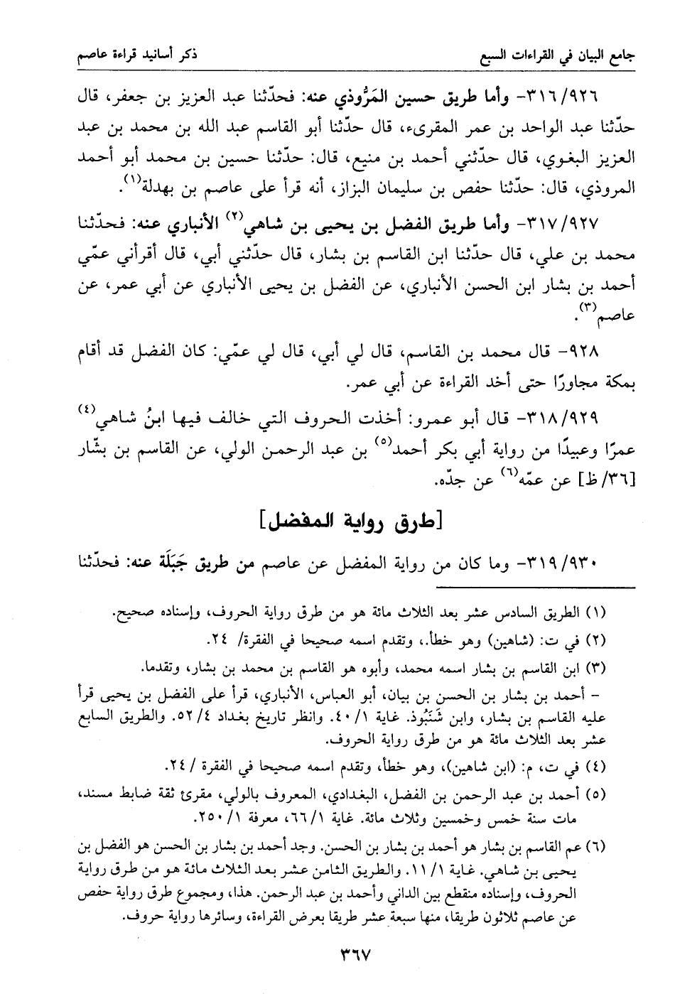 927/ 317 - وأما طريق الفضل بن يحيى بن شاهي «2» الأنباري عنه: فحدّثنا محمد بن علي، قال حدّثنا ابن القاسم بن بشار، قال حدّثني أبي، قال أقرأني عمّي أحمد بن بشار ابن الحسن الأنباري، عن الفضل بن يحيى الأنباري عن أبي عمر، عن عاصم «3».