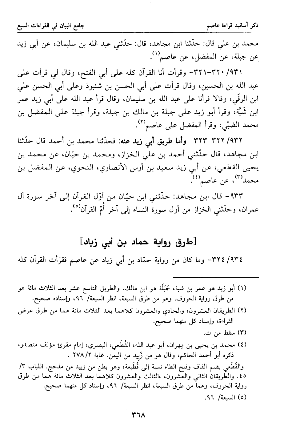 932/ 322 - 323 - وأما طريق أبي زيد عنه: فحدّثنا محمد بن أحمد قال حدّثنا ابن مجاهد، قال حدّثني أحمد بن علي الخزاز، ومحمد بن حيّان، عن محمد بن يحيى القطعي، عن أبي زيد سعيد بن أوس الأنصاري، النحوي، عن المفضل بن محمد «3»، عن عاصم «4».