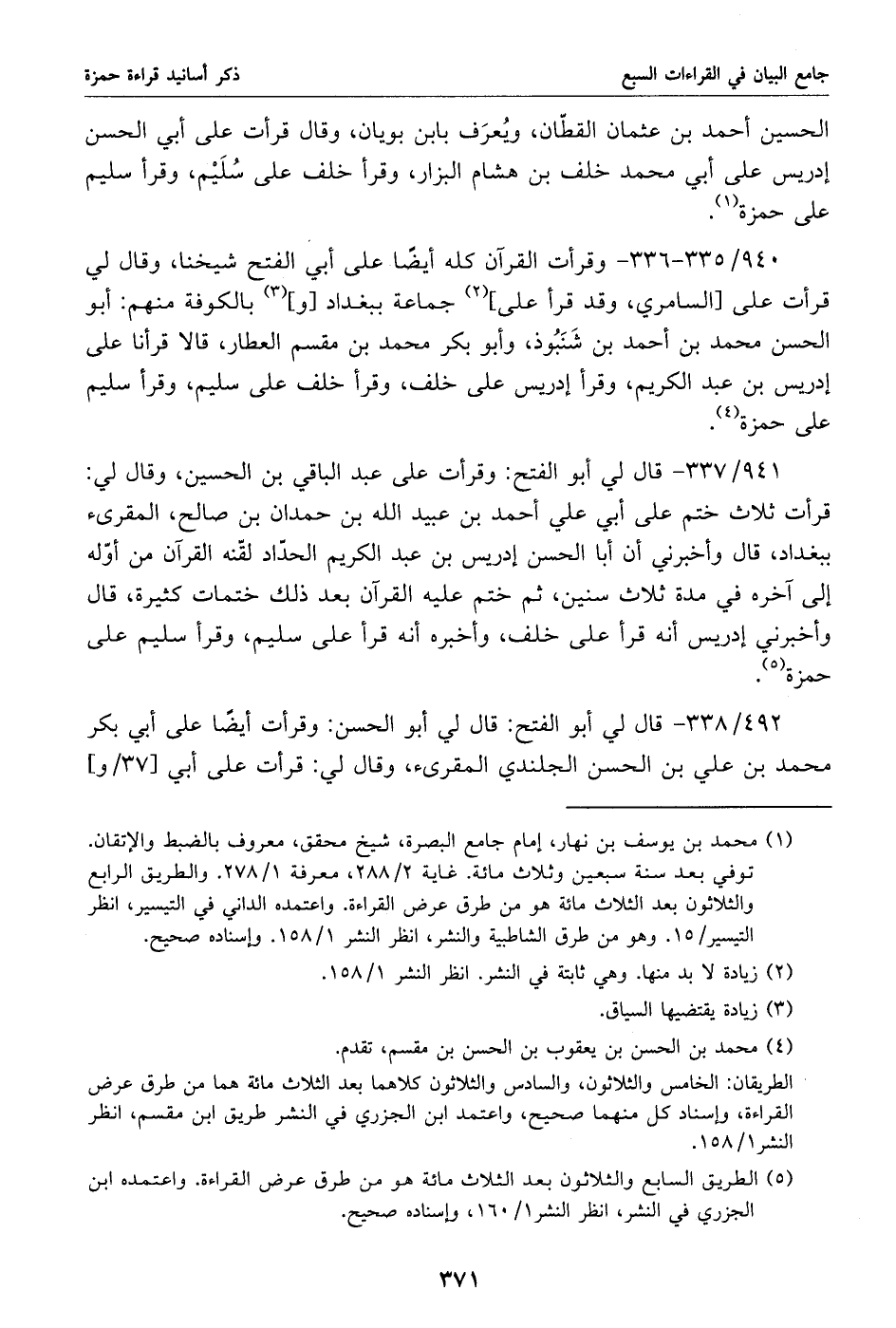 940/ 335 - 336 - وقرأت القرآن كله أيضا على أبي الفتح شيخنا، وقال لي قرأت على [السامري، وقد قرأ على] «2» جماعة ببغداد [و] «3» بالكوفة منهم: أبو الحسن محمد بن أحمد بن شنبوذ، وأبو بكر محمد بن مقسم العطار، قالا قرأنا على إدريس بن عبد الكريم، وقرأ إدريس على خلف، وقرأ خلف على سليم، وقرأ سليم على حمزة «4».