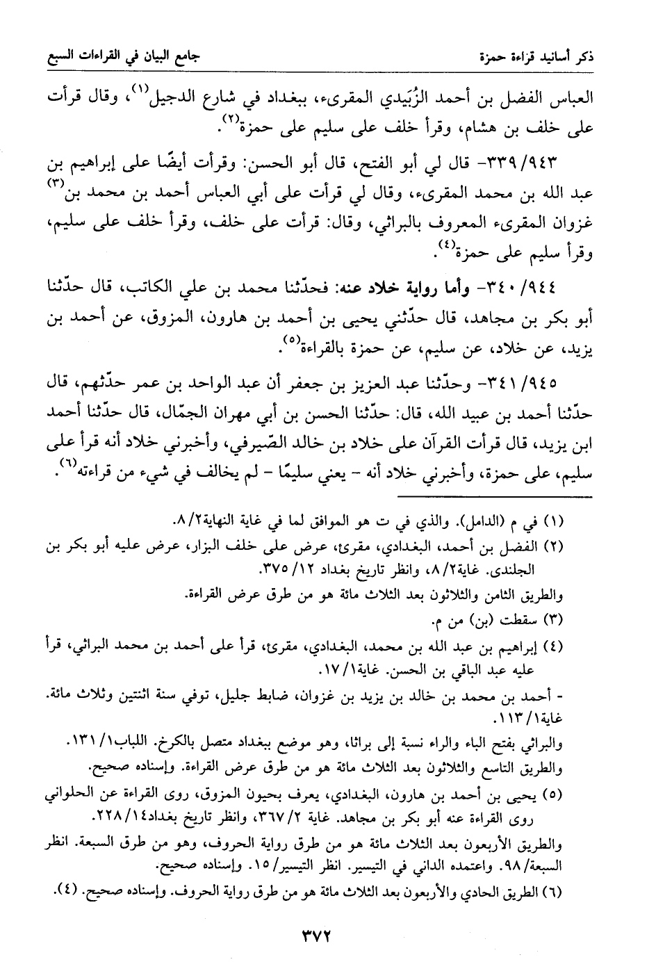 944/ 340 - وأما رواية خلاد عنه: فحدّثنا محمد بن علي الكاتب، قال حدّثنا أبو بكر بن مجاهد، قال حدّثني يحيى بن أحمد بن هارون، المزوق، عن أحمد بن يزيد، عن خلاد، عن سليم، عن حمزة بالقراءة «5».