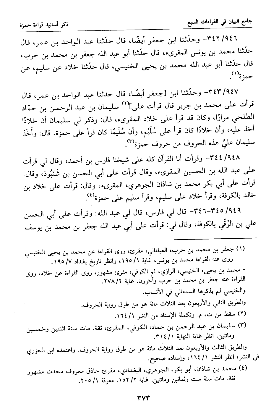 947/ 343 - وحدّثنا ابن [جعفر أيضا، قال حدثنا عبد الواحد بن عمر، قال قرأت على محمد بن جرير قال قرأت على] «2» سليمان بن عبد الرحمن بن حمّاد الطلحي مرارا، وكان قد قرأ على خلاد المقرئ، قال: وذكر لي سليمان أن خلادا أخذ عليه، وأن خلادا كان قرأ على سليم، وأن سليما كان قرأ على حمزة. قال: وأخذ سليمان عليّ هذه الحروف من حروف حمزة «3».