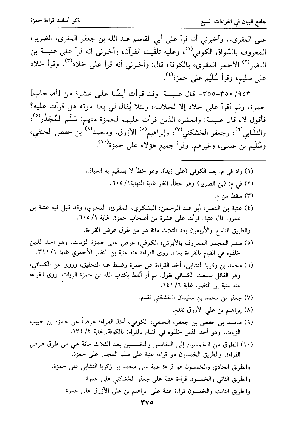953/ 350 - 355 - قال عنبسة: وقد قرأت أيضا على عشرة من [أصحاب] حمزة، ولم أقرأ على خلاد إلا لجلالته، ولئلا يقال لي بعد موته هل قرأت عليه؟