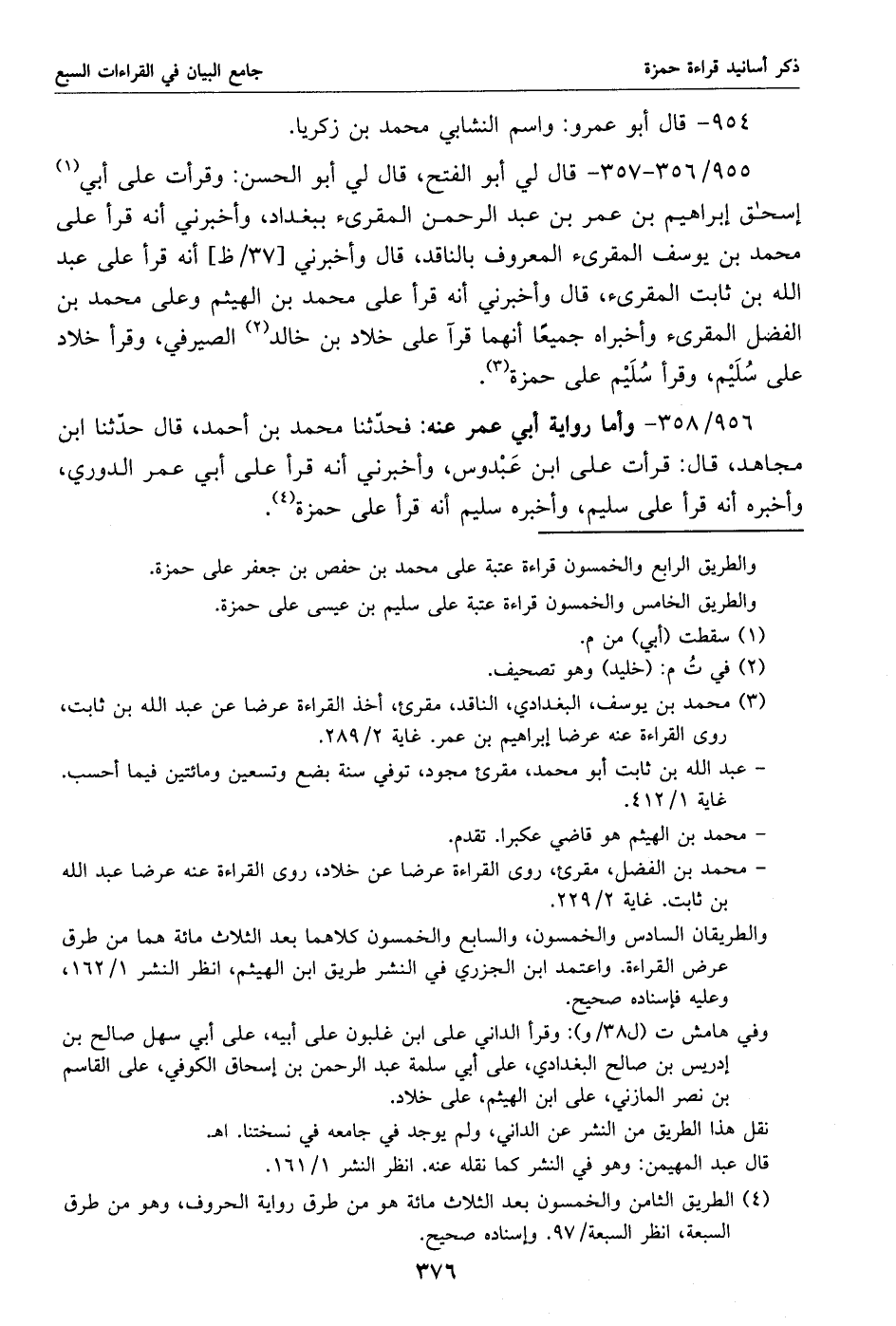 956/ 358 - وأما رواية أبي عمر عنه: فحدّثنا محمد بن أحمد، قال حدّثنا ابن مجاهد، قال: قرأت على ابن عبدوس، وأخبرني أنه قرأ على أبي عمر الدوري، وأخبره أنه قرأ على سليم، وأخبره سليم أنه قرأ على حمزة «4».