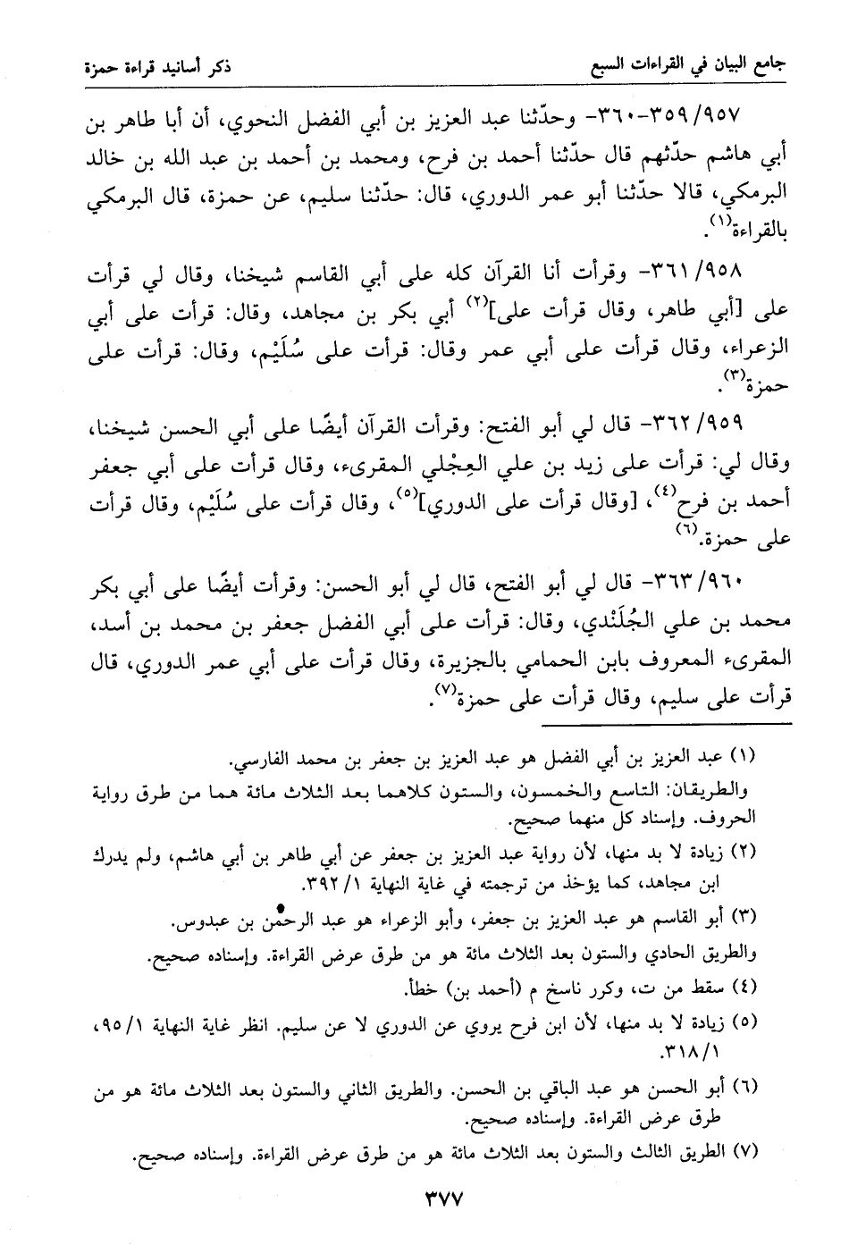 958/ 361 - وقرأت أنا القرآن كله على أبي القاسم شيخنا، وقال لي قرأت على [أبي طاهر، وقال قرأت على] «2» أبي بكر بن مجاهد، وقال: قرأت على أبي الزعراء، وقال قرأت على أبي عمر وقال: قرأت على سليم، وقال: قرأت على حمزة «3».