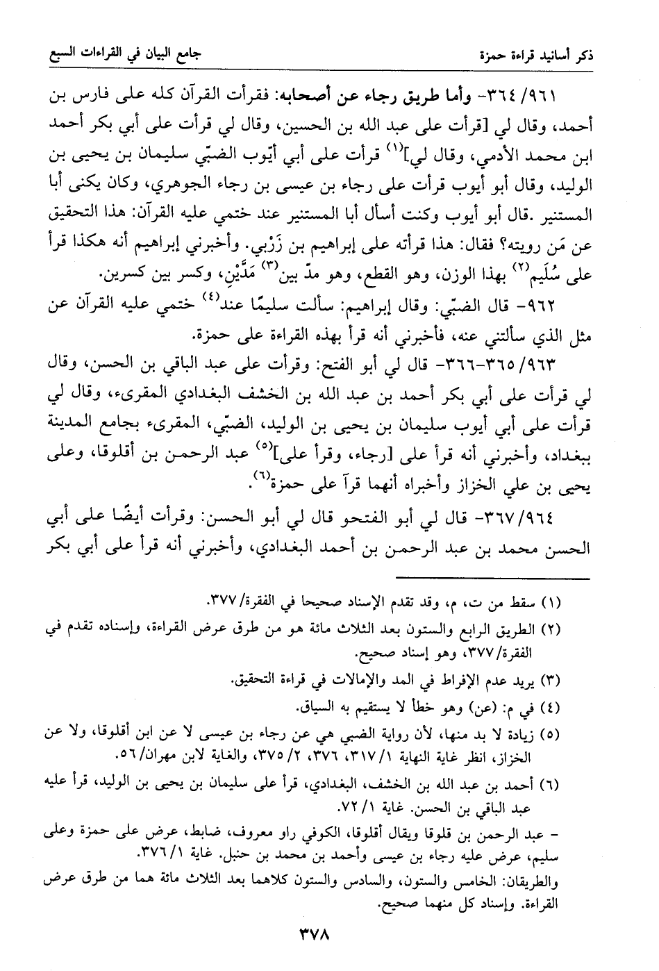 963/ 365 - 366 - قال لي أبو الفتح: وقرأت على عبد الباقي بن الحسن، وقال لي قرأت على أبي بكر أحمد بن عبد الله بن الخشف البغدادي المقرئ، وقال لي قرأت على أبي أيوب سليمان بن يحيى بن الوليد، الضبّي، المقرئ بجامع المدينة ببغداد، وأخبرني أنه قرأ على [رجاء، وقرأ على] «5» عبد الرحمن بن أقلوقا، وعلى يحيى بن علي الخزاز وأخبراه أنهما قرآ على حمزة «6».