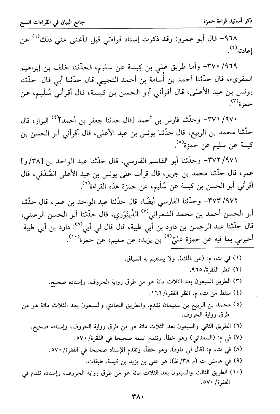 971/ 372 - وحدّثنا أبو القاسم الفارسي، قال حدّثنا عبد الواحد بن [38/ و] عمر، قال حدّثنا محمد بن جرير، قال قرأت على يونس بن عبد الأعلى الصّدفي، قال أقرأني أبو الحسن بن كيسة عن سليم، عن حمزة هذه القراءة «6».