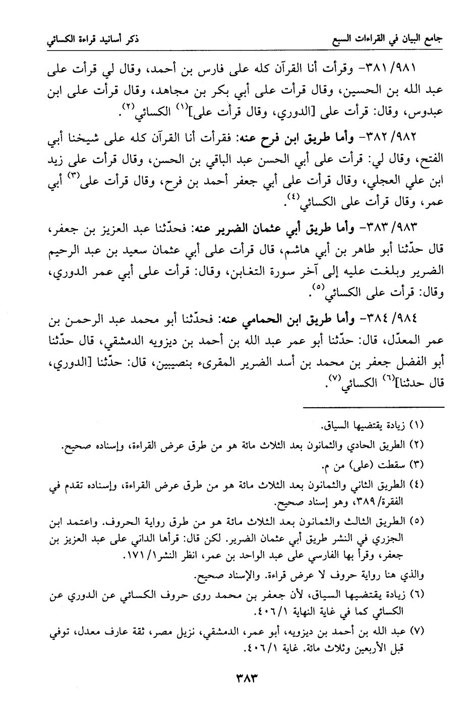 981/ 381 - وقرأت أنا القرآن كله على فارس بن أحمد، وقال لي قرأت على عبد الله بن الحسين، وقال قرأت على أبي بكر بن مجاهد، وقال قرأت على ابن عبدوس، وقال: قرأت على [الدوري، وقال قرأت على] «1» الكسائي «2».