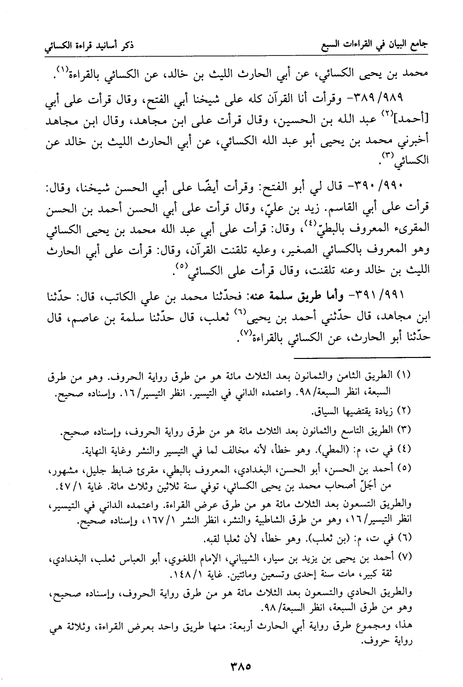 989/ 389 - وقرأت أنا القرآن كله على شيخنا أبي الفتح، وقال قرأت على أبي [أحمد] «2» عبد الله بن الحسين، وقال قرأت على ابن مجاهد، وقال ابن مجاهد أخبرني محمد بن يحيى أبو عبد الله الكسائي، عن أبي الحارث الليث بن خالد عن الكسائي «3».