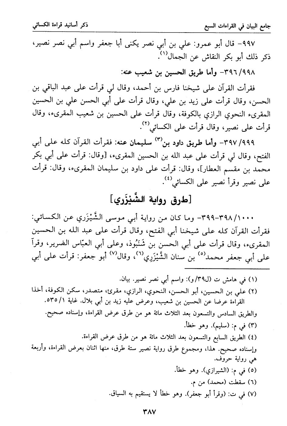 999/ 397 - وأما طريق داود بن «3» سليمان عنه: فقرأت القرآن كله على أبي الفتح، وقال لي قرأت على عبد الله بن الحسين المقرئ، [وقال: قرأت على أبي بكر محمد بن مقسم العطار]، وقال: قرأت على داود بن سليمان المقرئ، وقال: قرأت على نصير وقرأ نصير على الكسائي «4».
