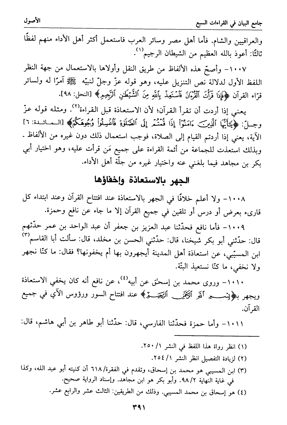 1007 - وأصحّ هذه الألفاظ من طريق النقل وأولاها بالاستعمال من جهة النظر اللفظ الأول لدلالة نص التنزيل عليه، وهو قوله عزّ وجلّ لنبيّه صلى الله عليه وسلم آمرا له ولسائر قرّاء القرآن فإذا قرأت القرآن فاستعذ بالله من الشيطن الرّجيم [النحل: 98].