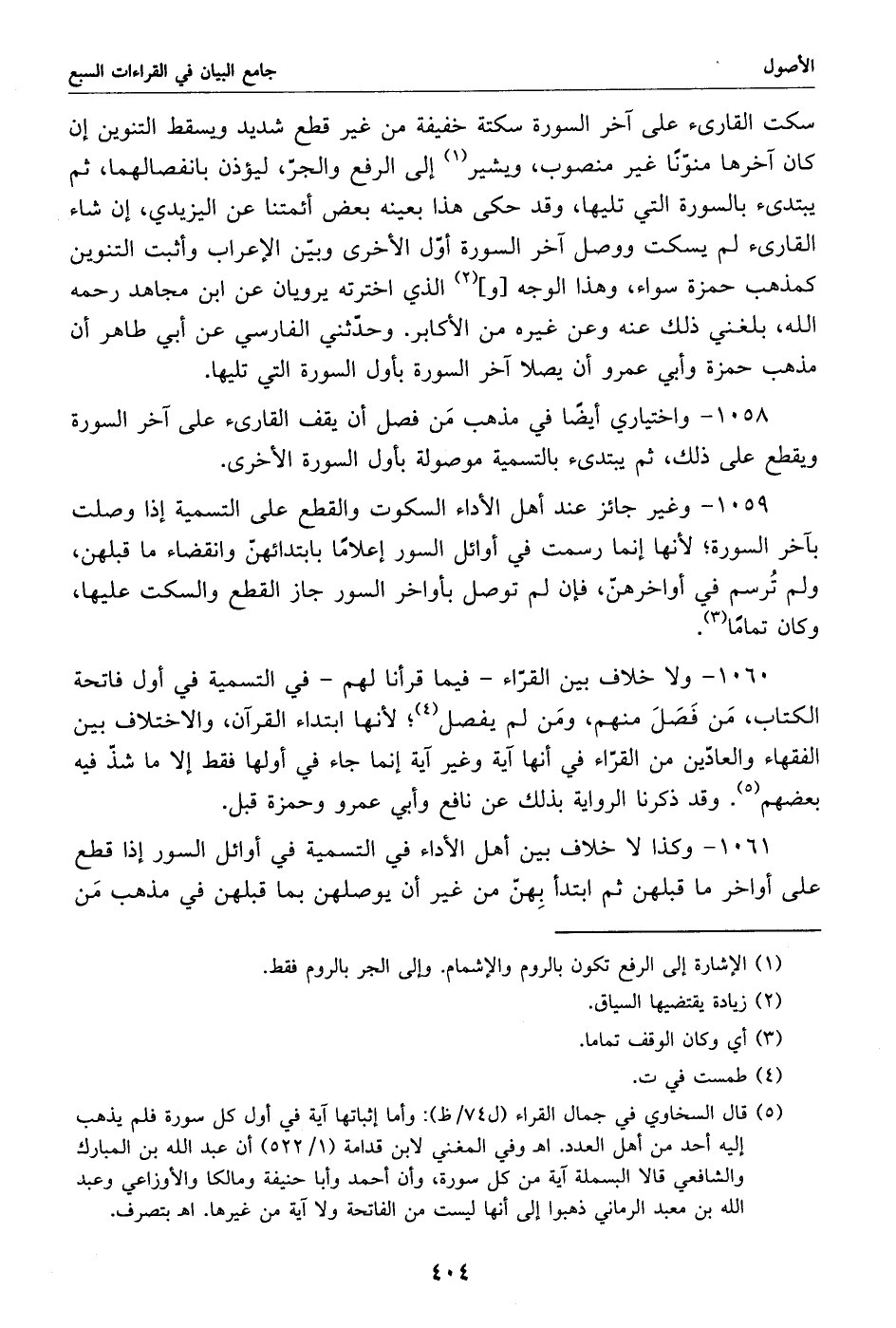 1061 - وكذا لا خلاف بين أهل الأداء في التسمية في أوائل السور إذا قطع على أواخر ما قبلهن ثم ابتدأ بهنّ من غير أن يوصلهن بما قبلهن في مذهب من
