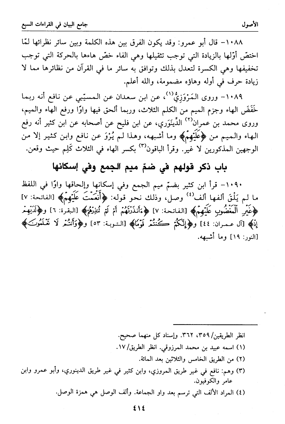 1090 - قرأ ابن كثير بضمّ ميم الجمع وفي إسكانها وإلحاقها واوا في اللفظ ما لم يلق ألفها ألف «4» وصل، وذلك نحو قوله: أنعمت عليهم [الفاتحة: 7] غير المغضوب عليهم [الفاتحة: 7] ءأنذرتهم أم لم تنذرهم [البقرة: 6] ولديهم إذ [آل عمران: 44] وإنّكم كنتم قوما [التوبة: 53] وو أنتم لا تعلمون [النور: 19] وما أشبهه.