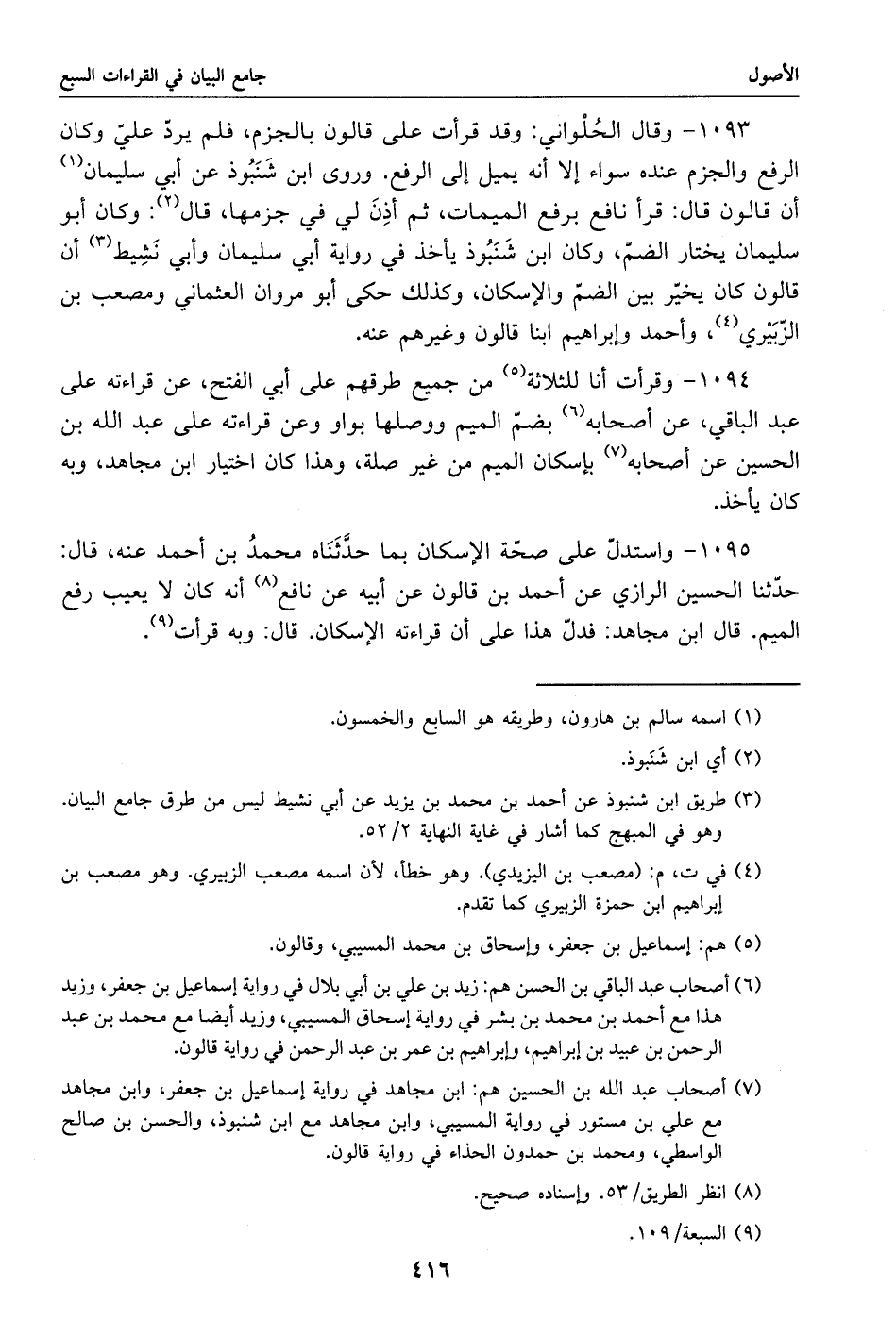 1093 - وقال الحلواني: وقد قرأت على قالون بالجزم، فلم يردّ عليّ وكان الرفع والجزم عنده سواء إلا أنه يميل إلى الرفع. وروى ابن شنبوذ عن أبي سليمان «1» أن قالون قال: قرأ نافع برفع الميمات، ثم أذن لي في جزمها، قال «2»: وكان أبو سليمان يختار الضمّ، وكان ابن شنبوذ يأخذ في رواية أبي سليمان وأبي نشيط «3» أن قالون كان يخيّر بين الضمّ والإسكان، وكذلك حكى أبو مروان العثماني ومصعب بن الزّبيري «4»، وأحمد وإبراهيم ابنا قالون وغيرهم عنه.