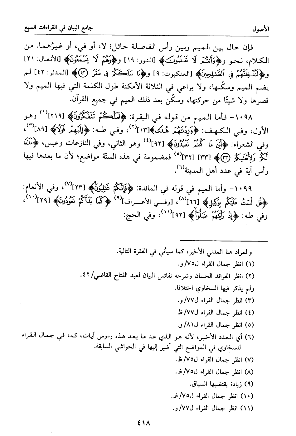 1098 - فأما الميم من قوله في البقرة: لعلّكم تتفكّرون [219] «1» وهو الأول، وفي الكهف: وزدنهم هدى [13] «2»، وفي طه: إليهم قولا [89] «3»، وفي الشعراء: أين ما كنتم تعبدون [92] «4» وهو الثاني، وفي النازعات وعبس، متعا لّكم ولأنعمكم (33) [33] [32] «5» فمضمومة في هذه الستّة مواضع؛ لأن ما بعدها فيها رأس آية في عدد أهل المدينة «6».