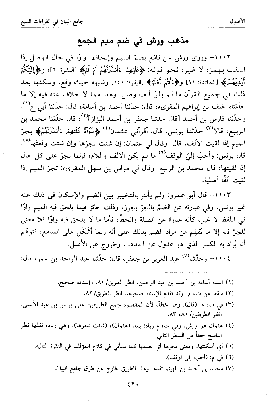 1103 - قال أبو عمرو: ولم يأت بالتخيير بين الضم والإسكان في ذلك عنه غير يونس، وفي عبارته عن الضمّ بالجرّ يجوز، وذلك جائز فيما يلحق فيه الميم واوا في اللفظ لا غير، كأنه عبارة عن الصلة والحطّ، فأما ما لا يلحق فيه واوا فلا معنى للجرّ فيه إلا ما يفهم من مراد الضم بذلك على أنه ربما أشكل على السامع، فتوهّم أنه يراد به الكسر الذي هو عدول عن المذهب وخروج عن الأصل.