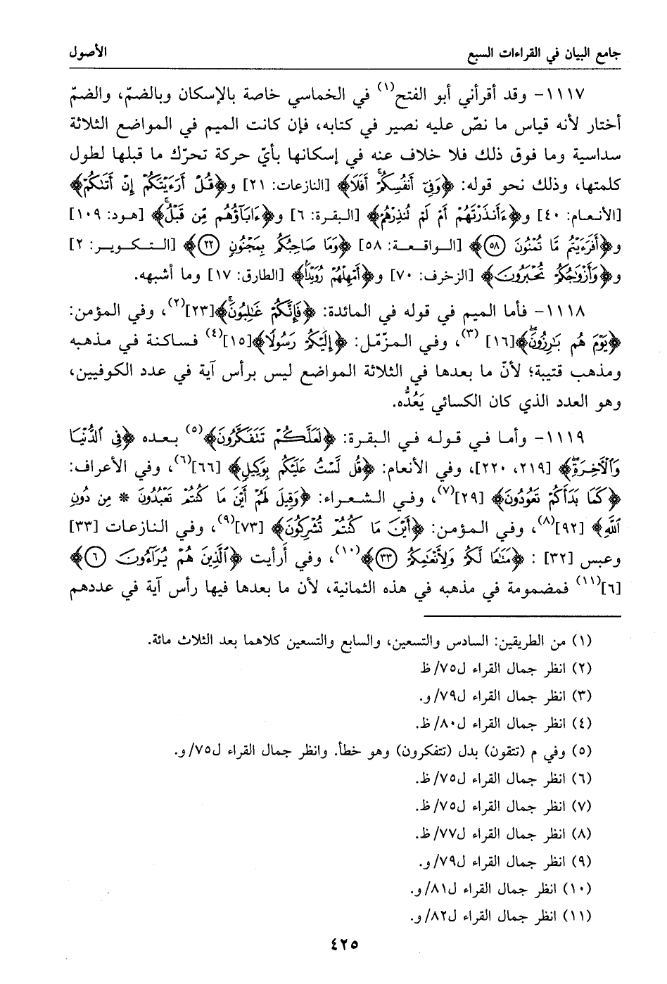 1117 - وقد أقرأني أبو الفتح «1» في الخماسي خاصة بالإسكان وبالضمّ، والضمّ أختار لأنه قياس ما نصّ عليه نصير في كتابه، فإن كانت الميم في المواضع الثلاثة سداسية وما فوق ذلك فلا خلاف عنه في إسكانها بأيّ حركة تحرّك ما قبلها لطول كلمتها، وذلك نحو قوله: وفى أنفسكم أفلا [النازعات: 21] وقل أرءيتكم إن أتئكم [الأنعام: 40] وءأنذرتهم أم لم تنذرهم [البقرة: 6] وءاباؤهم مّن قبل [هود: 109] وأفرءيتم مّا تمنون (58) [الواقعة: 58] وما صاحبكم بمجنون (22) [التكوير: 2] وو أزوجكم تحبرون [الزخرف: 70] وأمهلهم رويدا [الطارق: 17] وما أشبهه.